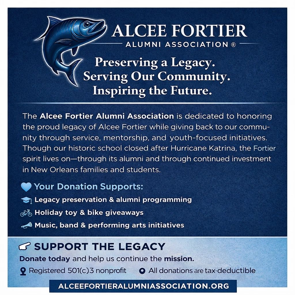 The Alcee Fortier Alumni Association is collecting donations to help provide bicycles to children this Christmas. Your support—no matter the amount—helps us bless families and continue our mission of giving back to the community. Thank you for helping us make a child’s holiday brighter!
